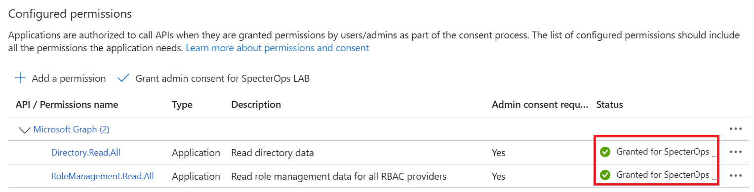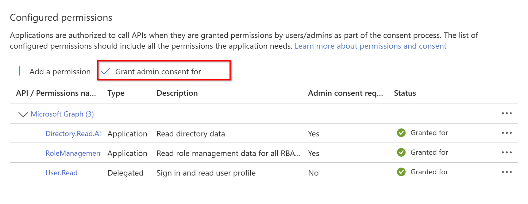 1. After being redirected to API Permissions again, you should see both permissions as Granted.