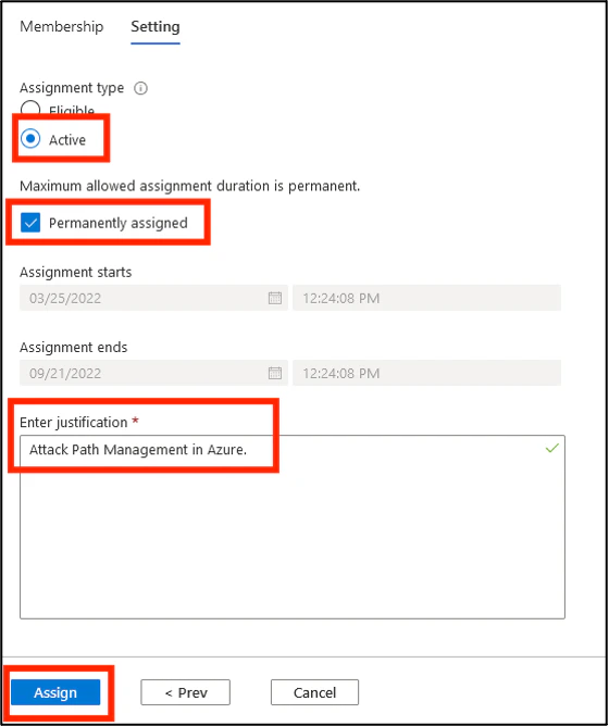 7. Ensure that the Assignment type is Active and the Permanently assigned box is checked. Provide a justification and click Assign.