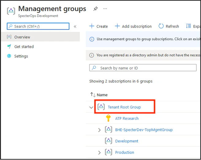 Note: If you do not have any management groups, you may either create your Tenant Root Group following the prompts in the middle of the screen to ensure future visibility if another administrator begins use of subscriptions, or you may skip this section altogether. If you skip this section, you will see a warning in the logs for each collection indicating the lack of ability to collect this data accordingly.