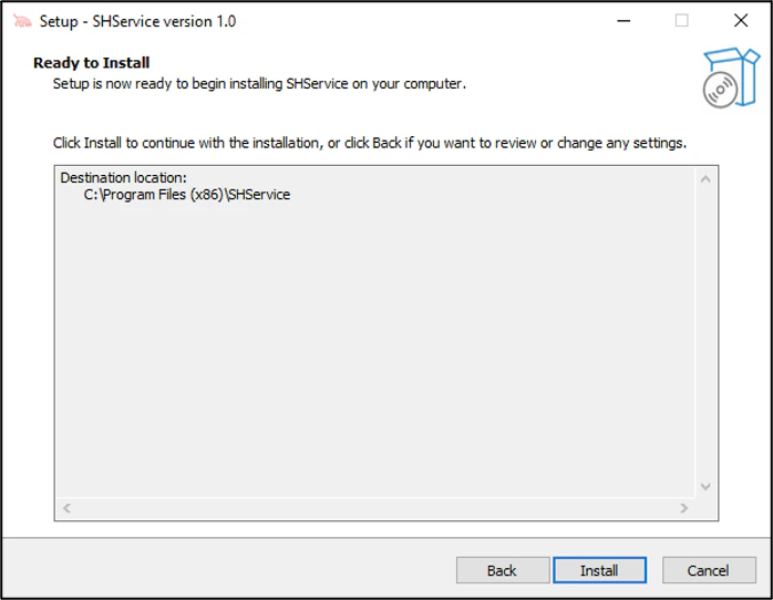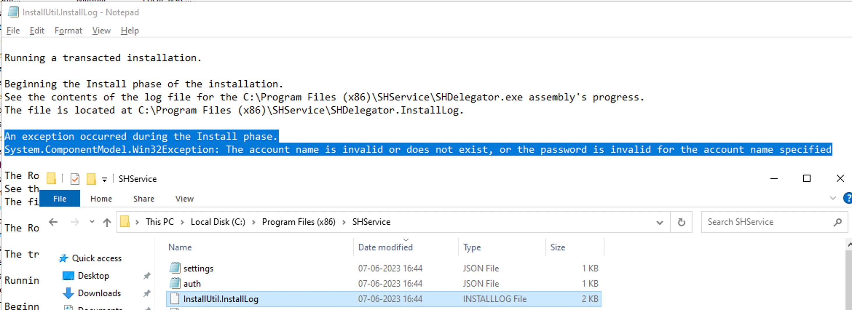 The installation log may be of help in troubleshooting and can be found in the file “InstallUtil.Install.Log” in the installation directory; the default path is “C:\Program Files (x86)\SHService\InstallUtil.Install.Log”.
