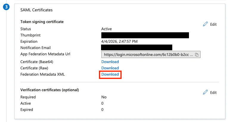 1. Scroll down to the SAML Certificates section and download the Metadata XML.