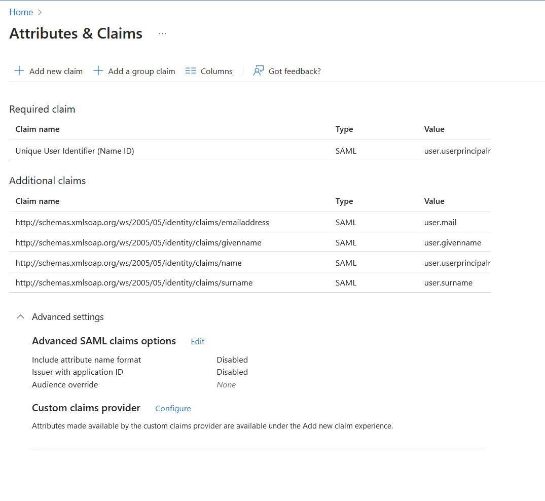 Verify your attributes and claims use a proper schema in the claim name, and that you have a properly mapped claim for “user.mail” as in the example below. An indicator that this is necessary is when an authentication attempt returns the response: “assertion does not meet requirements for user lookup”.