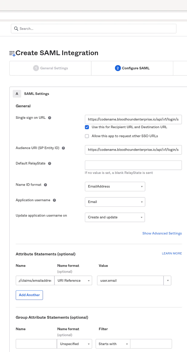 The following attribute settings are required for Okta to integrate with BloodHound Enterprise: Complete SAML Integration Configuration