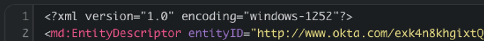 1. Copy the metadata provided by Okta and save it into a metadata.xml file. ATTENTION FIREFOX USERS: FireFox may prepend an additional heading to the metadata.xml file, resulting in an error creating the SAML integration within BloodHound Enterprise. If your extracted metadata.xml looks like the following, delete line 1 try again. See https://support.mozilla.org/en-US/questions/1387904 for more details.
