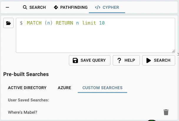 • Custom user-saved Cypher queries - You can save your favorite Cypher queries directly in BloodHound. Write your query and click the “Save Query” button to give it a name and store it.