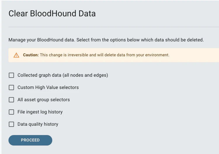 - Clear database option - Did you accidentally upload bad data or need to start fresh?BloodHound has you covered with the built-in ability to clear various data! As the warning below shows, changes in this section are irreversible. These options are available to users with the Administrator role under the Administration -> Database Management section.